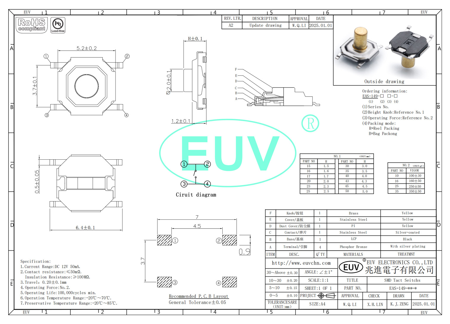 5.2mmx5.2mm 4腳平貼 銅頭 貼片輕觸開關(guān)