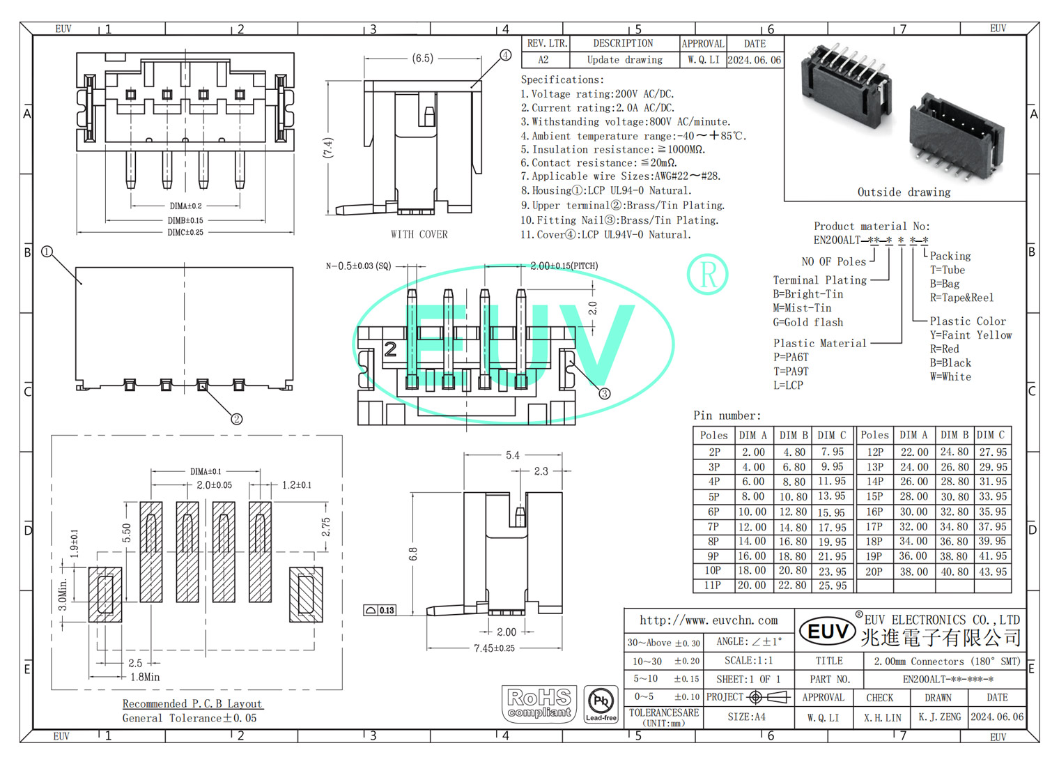 2.0mm間距 臥式彎插 帶扣 線對板連接器