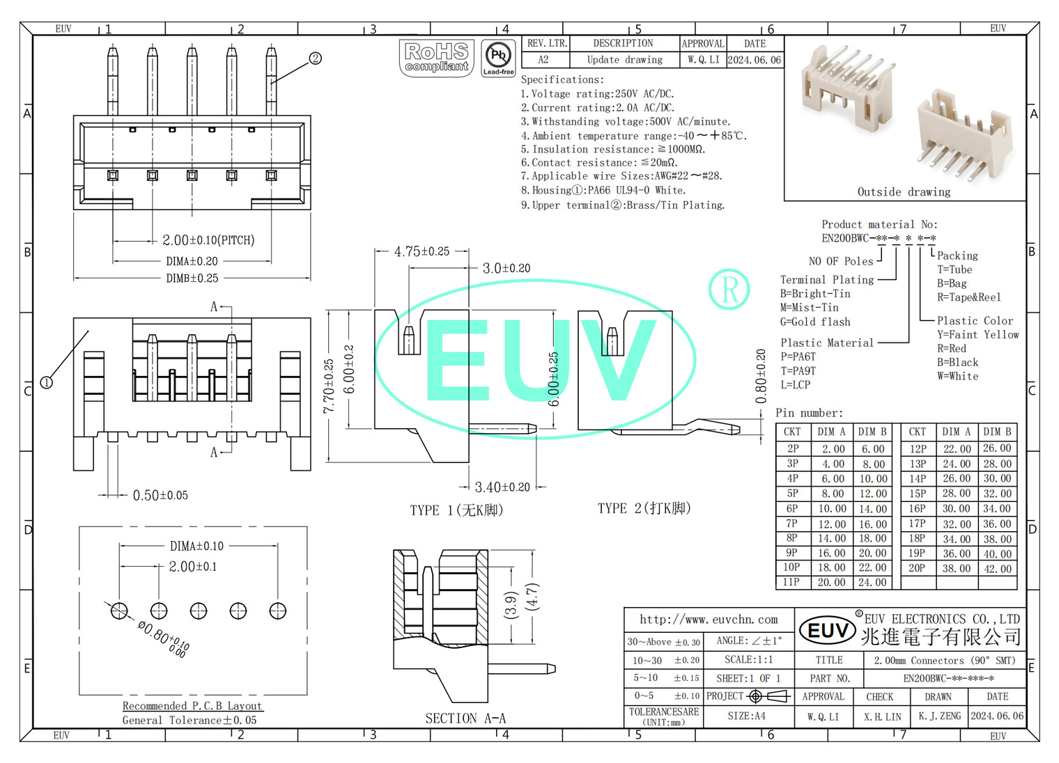 2.0mm間距 臥式彎插 帶扣 線對板連接器